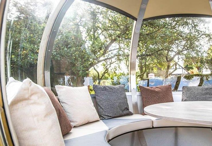 The Oval Pod offers the unique qualities of being a dining, lounging, study and entertaining environment for eight guests. It has comfortable edge seating with a centre table. The table is adjustable so it can be folded from a larger dining table to a smaller coffee table. Ambient lighting creates a unique mood and atmosphere in the interior with embedded ceiling LED lights. With 360* uninterrupted panoramic views provided by multiple configurations of clear windows, allows for significant increased light-in, generous outside views and a more spacious feel.